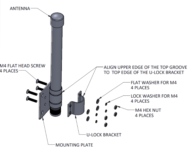 Clamp antenna to the mounting plate with a u-lock bracket and 4x m4 (flat head screw, flat washer, lock washer, and hex nut), torque to 2.6nm 10%. Align upper edge of the top groove on antenna to the top edge of the u-lock bracket as shown:
