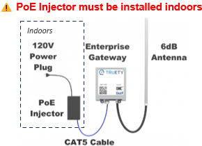 - Use the Ethernet port to power up the Gateway (120V PoE injector is included with the Gateway. Use PoE port)