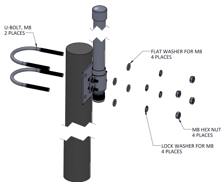Mount the antenna-mounting plate assembly to a pylon with 2x u-bolt and 4x m8 (flat washer, lock washer, and hex nut), torque to 15nm 10%.
